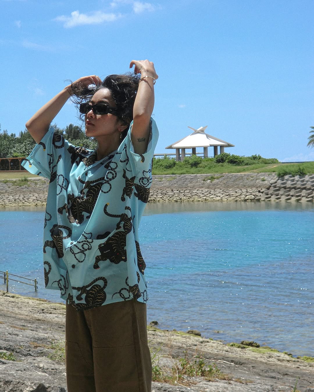 エキゾチックで妖艶、なんとも色っぽい動物や草花が特徴の現代アート作家 Miho Murakamiのグラフィックを落とし込んだ開襟シャツ。柔らかくて品のある風合いだけどイージーケアで扱いやすい、着心地抜群のポリエステル生地。ワイドシルエット。