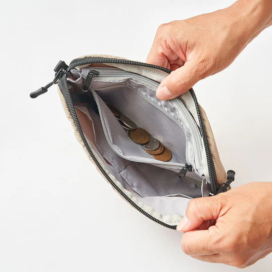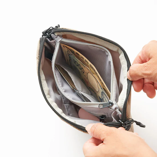 お金やカード、スマホにハンカチなどなど軽くでかけるときに必要なアイテムは全てこちらに収まります。生地は撥水処理済。
